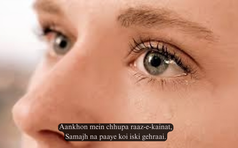 Aankhein rooh ki khidkiyan hoti hain, jo dilon ko apni gehraai aur izhaar se moh leti hain. Urdu shayari mein aankhon ke baare mein shayari ka ek khaas muqaam hai, jo pyar, intezaar, raaz, aur husn ke ehsaasaat ko mukhtasar asha’ar mein bunti hai. har ek jo aankhon ki jaadui taqat ko romantic aur shaayaraana andaaz mein ubhaarti hai.
